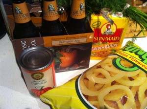 I can vouch for this one — surprisingly tasty! The raisins were the perfect sweet counterbalance to the cayenne and onion flavor. Shrimp were well-cooked and the use of pumpkin ale was brilliant!