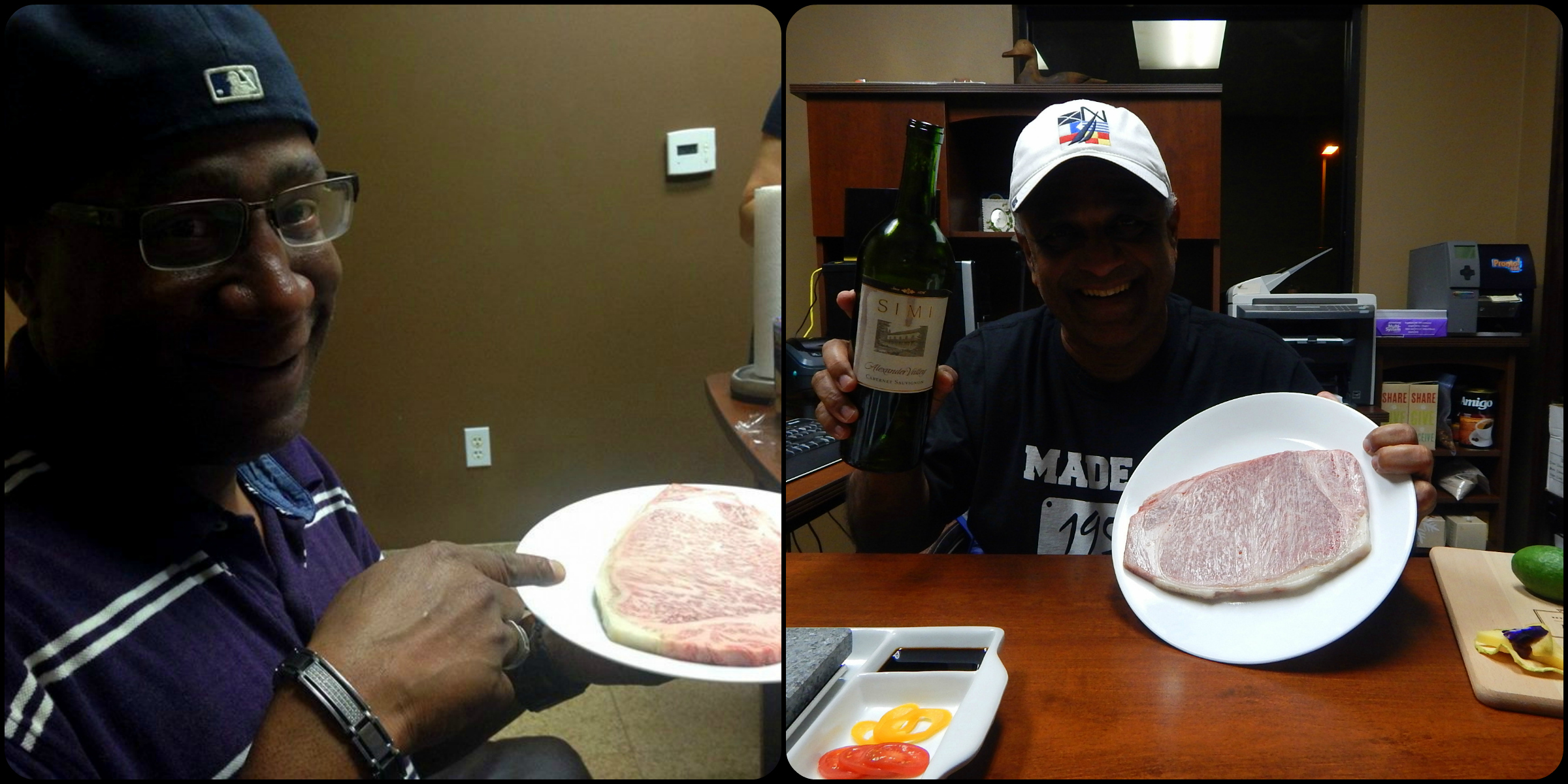The highlight of the evening was the Japanese Kobe steak. Anshu informed me that this was the highest grade of beef on the market. Kobe beef raised in Japan is graded from A1 -A5 , with A5 being the best quality. There is also a grading system called”BMS” (Beef Marbling Standard). The fat marbling of the meat is graded on a BMS scale from 1-12, with marble Score 12 being the highest. This steak that we were about to try was rated A5 with a BMS score of 12, exciting stuff! Throughout the world, Kobe Beef is much more expensive than any other cut of beef. At top Japanese markets, Kobe beef sells for more than $500 per Kg. According to CNN’s Money website, Kobe beef sells for at least $150 per pound. Needless to say, I felt very lucky to be treated to such a steak. I have NEVER tasted a more delicious cut of beef like this before! We ate it sashimi-style with a little soy sauce, which wasn’t necessary but it gave the fat that bit of saltiness while it melted in your mouth, outstanding! I felt like it would be a waste to even cook a steak of this quality.