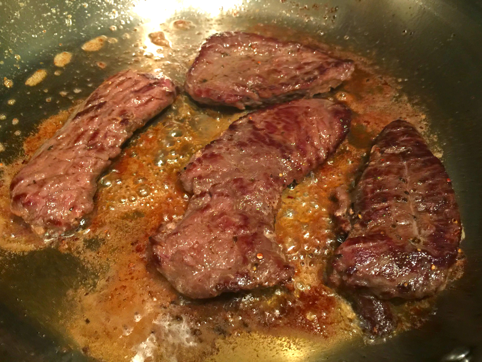 If you are using a sous vide device: Season the steaks with salt and pepper and place them in a vacuum sealed bag with a couple sprigs of thyme, 1/2 tbsp of each; dehydrated onion flakes and garlic flakes, and 1 Tbs of butter (optional). Seal the bag and set your device to 125 F and drop the bag in for 3-4 hours. Open the bag remove the steaks, strain and reserve the liquid to add to the pan along with the wine mixture described above. Sear the steaks very quickly before slicing into cubes and adding them to the final step of the recipe.