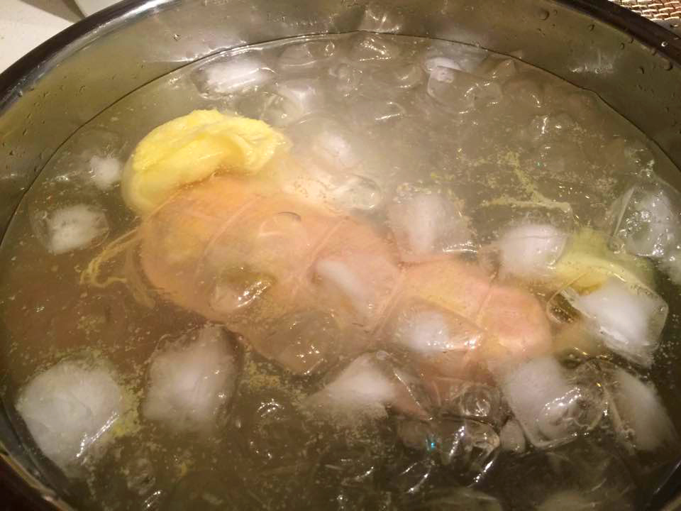 Day 3: Bring water or stock to a simmer. Carefully immerse the foie gras in the simmering liquid and poach for 90 seconds. Transfer immediately to an ice-water bath to cool. Once chilled and hard enough, remove from ice-water twisting the ends of the cheesecloth to tighten again.