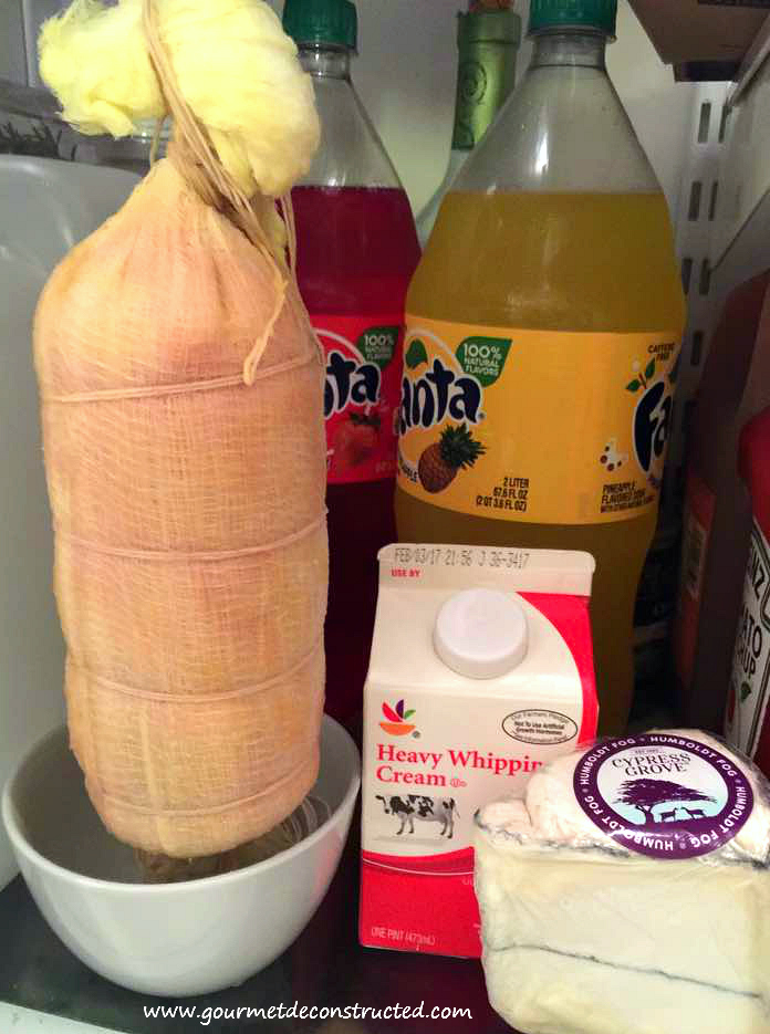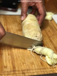 Day 2: Remove foie gras from the refrigerator 30 minutes before reshaping it. Layer two large pieces of cheesecloth or use a large white torchon on the countertop. Unwrap the foie gras, discard the plastic wrap and place it along a short end of the cheesecloth. Rolling it away from you, roll it up in the cheesecloth into a tight cylinder twisting and pressing one end first as you roll to force the foie gras into a compact log. At this juncture, hold one end of the cheesecloth tightly and wind the string around the end and tie a knot. Continue rolling the log from the other side to compress into a very tight log until you’ll see bits of foie gras being forced through the cheesecloth. At this time your foie gras is at room temperature and it can be poached right away but it would have to be reshaped into its original form after cooking. If you want to skip this reshaping step; refrigerate the log 24 more hours or until it has completely hardened and poach it. The torchon will keep its original shape and less fat will be wasted.
