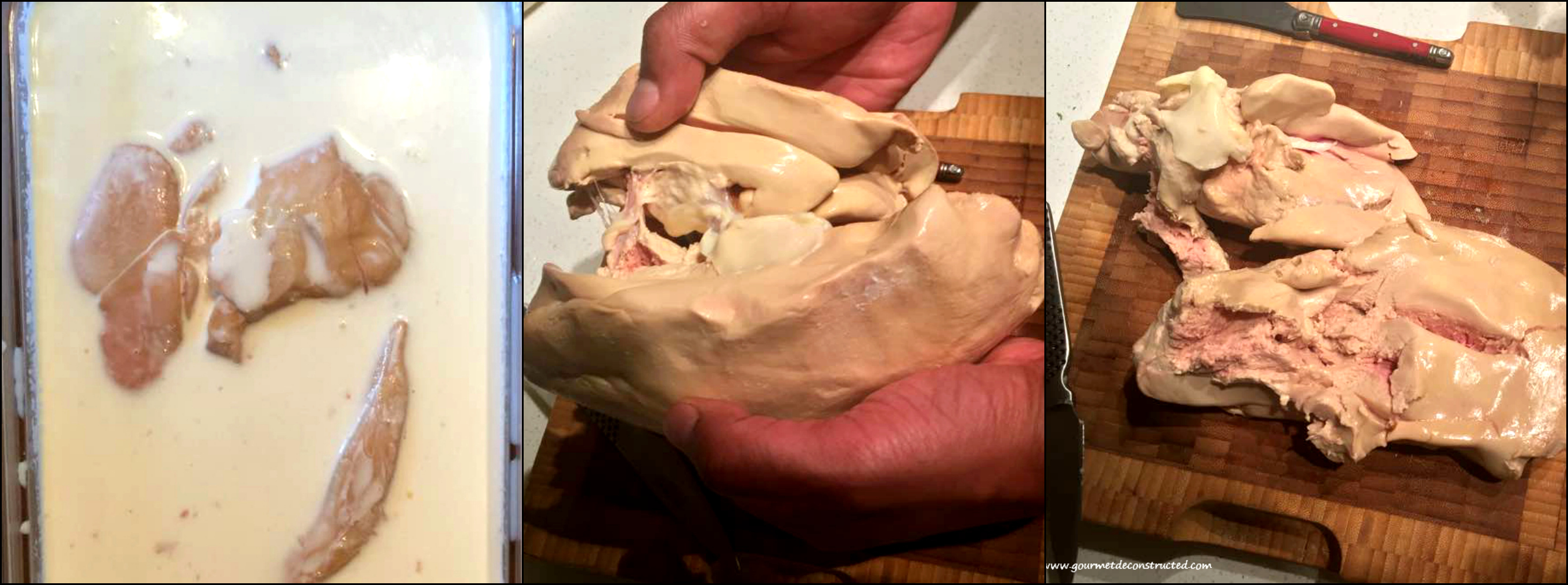 Day 1: Remove the foie gras from its package, place in an air tight container and submerge in milk, then cover and refrigerate for at least 12 hours. Put the dry seasonings in a bowl and mix well. Remove the foie gras from the milk and dry with paper towels. Spread a double layer of plastic wrap across your prep surface and spread half of the seasoning mix all over it. Pull apart the two lobes of the liver and prepare to remove as many veins from the foie gras as possible. This step is important because it gives the finished product more of a refined appearance. If the veins are left in, you will have defined red spots in the finished product.