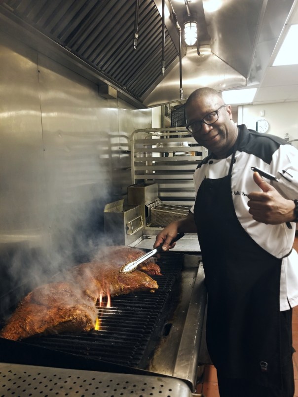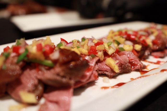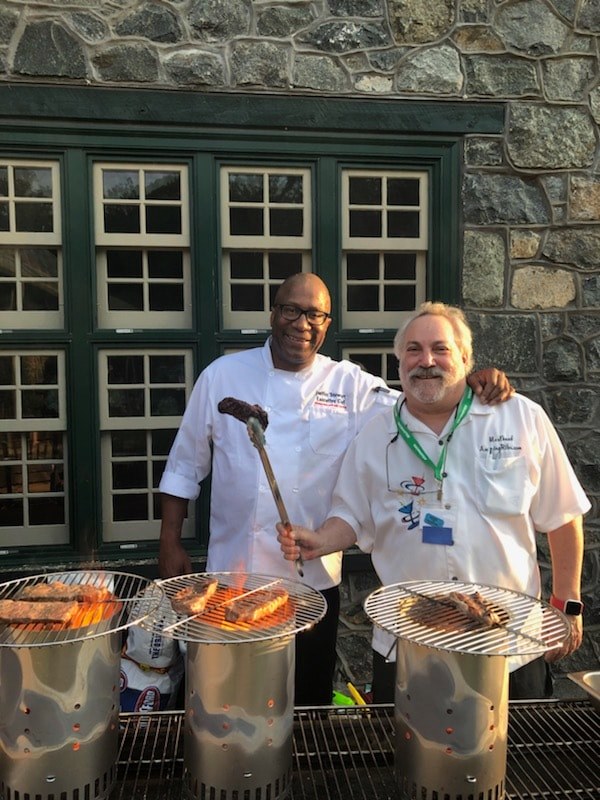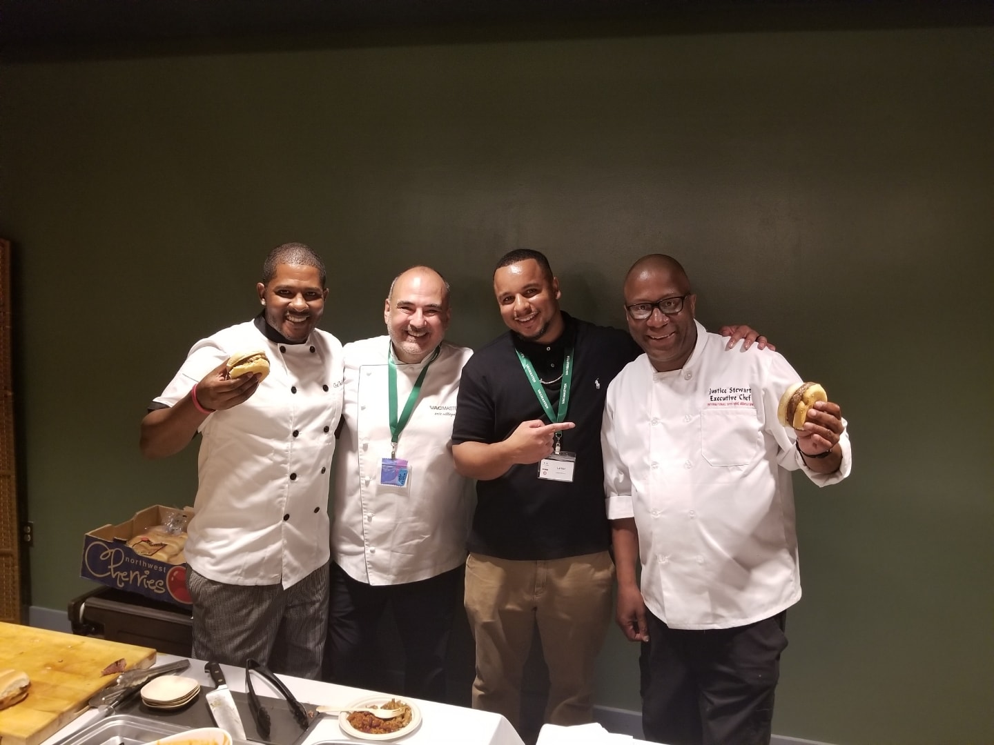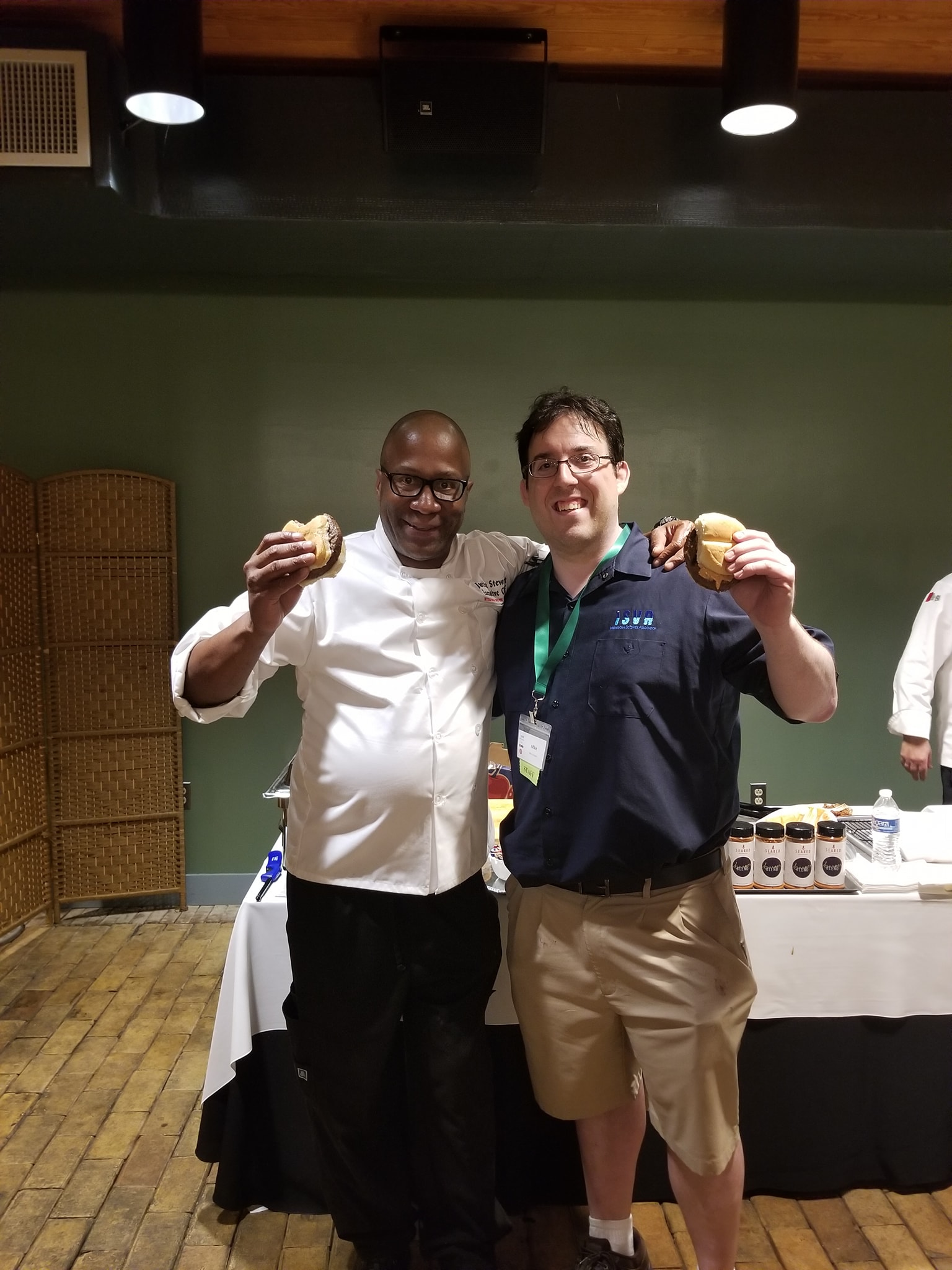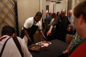 The Friday night reception kicked off with chefs AJ Schaller & Gerard Bertholon from CREA/Cuisine Solutions delivering the keynote to the attendees. Vacmaster also performed a cool cheese-making demo. The reception meal was wonderful as well. I prepared a Chilean Chacarrero sandwich featuring some amazing wagyu flank steak from the Allen Brothers. Elizabeth from Vesta Precision prepared this heavenly bacon peach bourbon glazed wagyu brisket served on cambazola cheese. Chef Eric Villegas showcased his delicious line of spices, Seared, with grilled wagyu burgers. Chefs David Pietranczyk from Polyscience & A.J. Schaller from CREA teamed up to prepare sous vide gochujang chicken wings, which were a big hit. Meathead Goldwyn had it going outside with 3 chimney grills and wagyu NY strip steaks. My good friend Jason Logsdon had us covered at the bar with his amazing alcohol infusions, with the highlights being his apple pie bourbon old fashioned and blackberry basil mojito. Overall, it was a fun & tasty evening and everyone enjoyed the food.