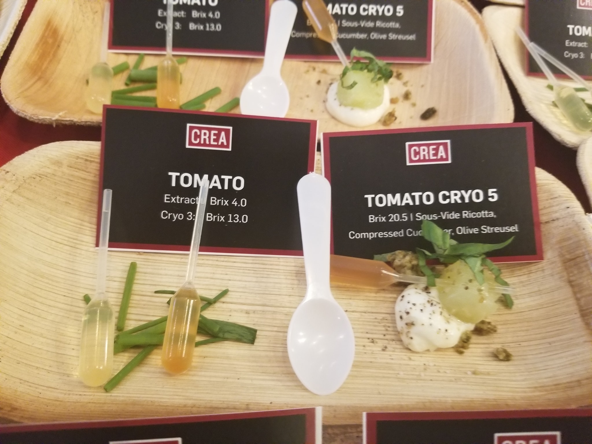 The Saturday keynote was delivered by Scott Heimendinger, founder of “Seattle Food Geek” and technical director of Modernist Cuisine. The sessions then kicked off with presentations by Christina Peters, Cole Wagoner, David Pietranczyk, and Claire Lower. I must admit I missed some of these presentations because I was in the kitchen preparing food, but the guests seemed very happy with the culinary education they were being provided with. Then the CREA team blew us all away with the next level of sous vide cooking, the cryoconcentration technique. They presented tomato trimming cryoconcentration with sous vide ricotta and compressed cucumber. It was very delicious, educational, and I look forward to learning more about this technique in the future.
