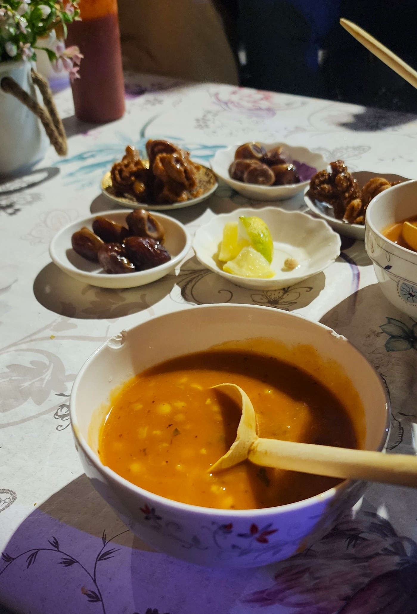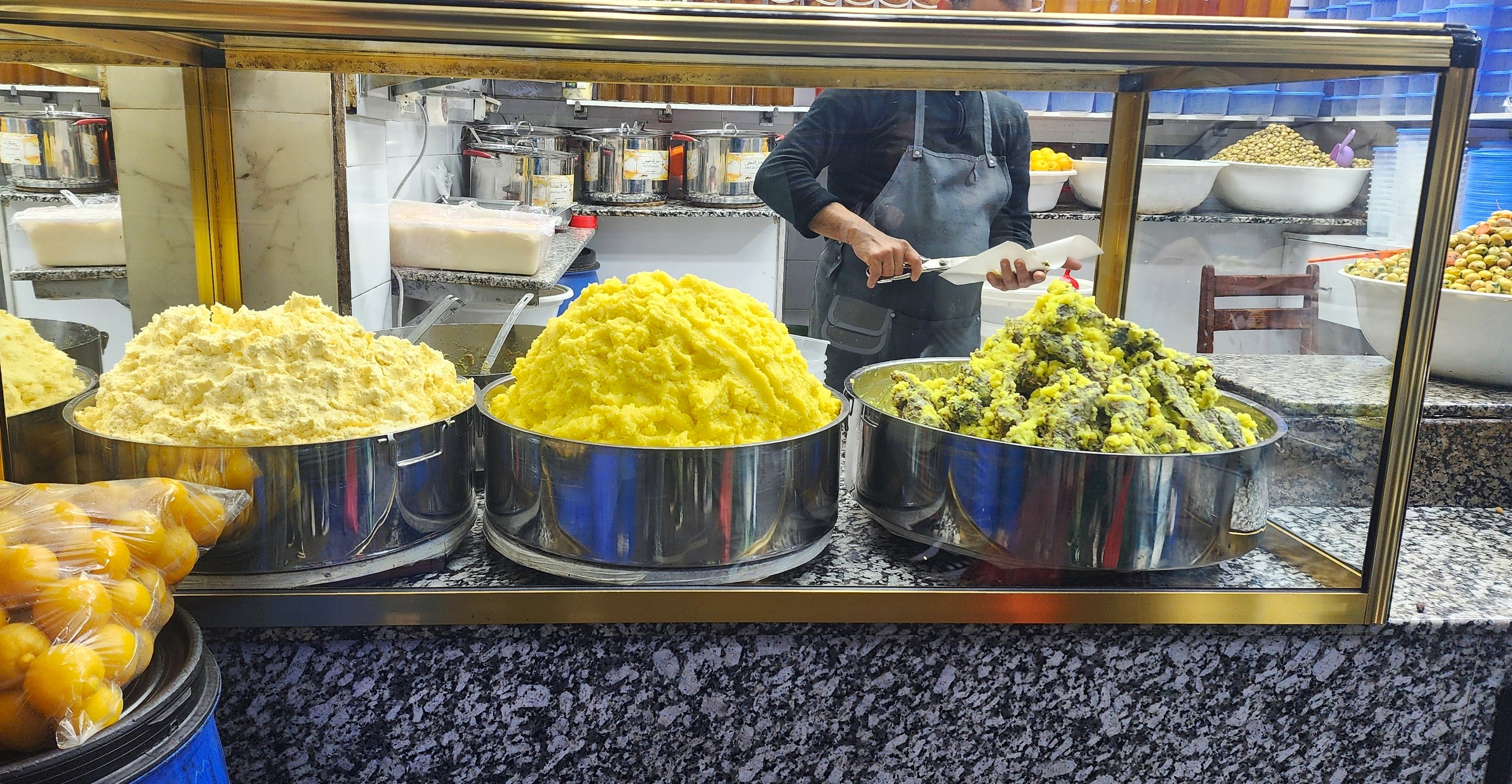 After getting set up in the riad we were off to our first food adventure. We booked a night time food tour with local chef and tour guide Mustapha. This was a delightful 3 ½ – 4 hour tour with visitors from different countries exploring Jemaa El-Fnaa Square and the markets. It also was an introduction to traditional Moroccan street food. We started at an small shop where we sampled different types of fresh olives and something I never tried before, Khlea. This is dried beef preserved in fat and spices. Flavor-wise it was seasoned well, and very beefy and this is commonly eaten with eggs for breakfast. I ended up purchasing a tub of it to bring home (recipe coming soon). Next we moved on to a butcher that specialized in chopped beef spleen sandwiches. His line was long but the sandwich was bursting with spices and worth the wait. Next up, Chez Hassan Booth #70 had a very spiced hot drink that consisted of tomato juice, ginger, galanga, cardamon, cloves and quite a few more spices. It was good, but not my favorite. We then went to a rather crowded corner of the Square to a woman selling Harira, which is Morocco’s most popular soup. It’s usually eaten to break the daily fast during Ramadan, it is combination of pasta, lentils, and chickpeas. Served with it were dates, lemon, and a sweet fried pastry, so good! Next up were Moroccan donuts that were a little greasy yet fluffy and topped with an argan oil and honey mixture served with mint tea.