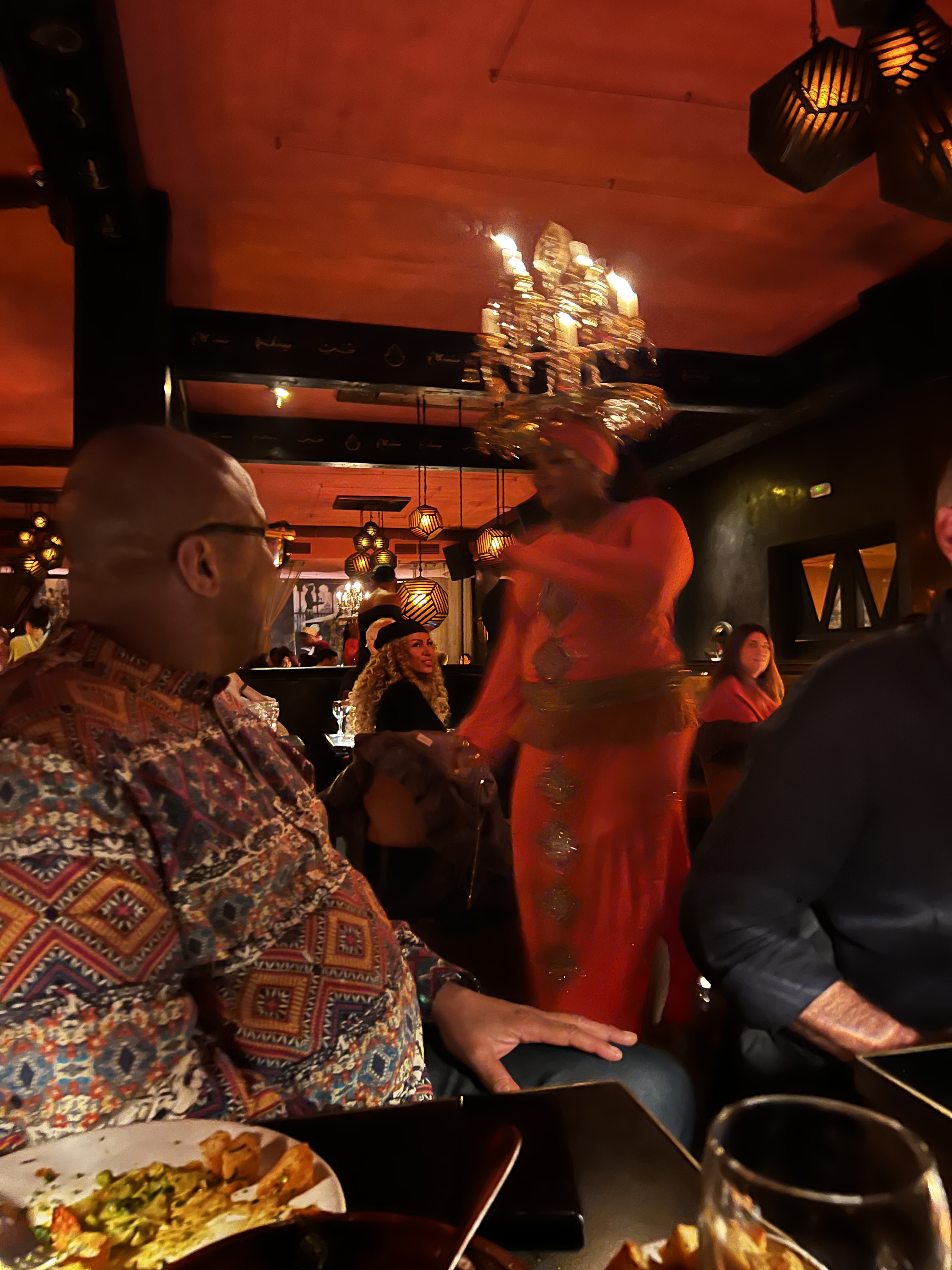 We ate lunch at Café Anosfa which is located in the Ensemble Artisanal, I had the Cous Cous Royale and she the Kefta Tagine, and both were really good. Next, our walk took us to Le Jardin Secret which is an urban respite in the middle of the chaotic Souks. This garden featured different types of trees including orange and lemon trees. The place was cool, but small and for the 100 MAD ($10 USD) price, there was not enough to see to justify the cost, plus it became crowded really fast. We visited Madrasa Ben Youssef which is an historic landmark with beautiful Islamic architecture which we enjoyed immensely. After a long day of walking it was time to head back to the riad to get ready for Emily’s birthday dinner at the upscale restaurant Comptoir Darna. This restaurant was located in the prestigious Hivernage district in the new city. It is billed as one of the best restaurants in Marrakech. It’s more of a dinner and show that lasts at least 3 hours, and reservations should be made in advance. We ordered lobster pastilla (a sweet and savory layered Moroccan pie), Prawn Tagine with peas, spinach and basil bisque, 8-hour slow cooked lamb shoulder that was melt in your mouth goodness. The most fun part of this evening was the impressive belly dancers. I mean these ladies were spinning around and performing all kinds of moves while balancing trays full of burning candles on their heads. Bravo! This ended another fun and food filled day.