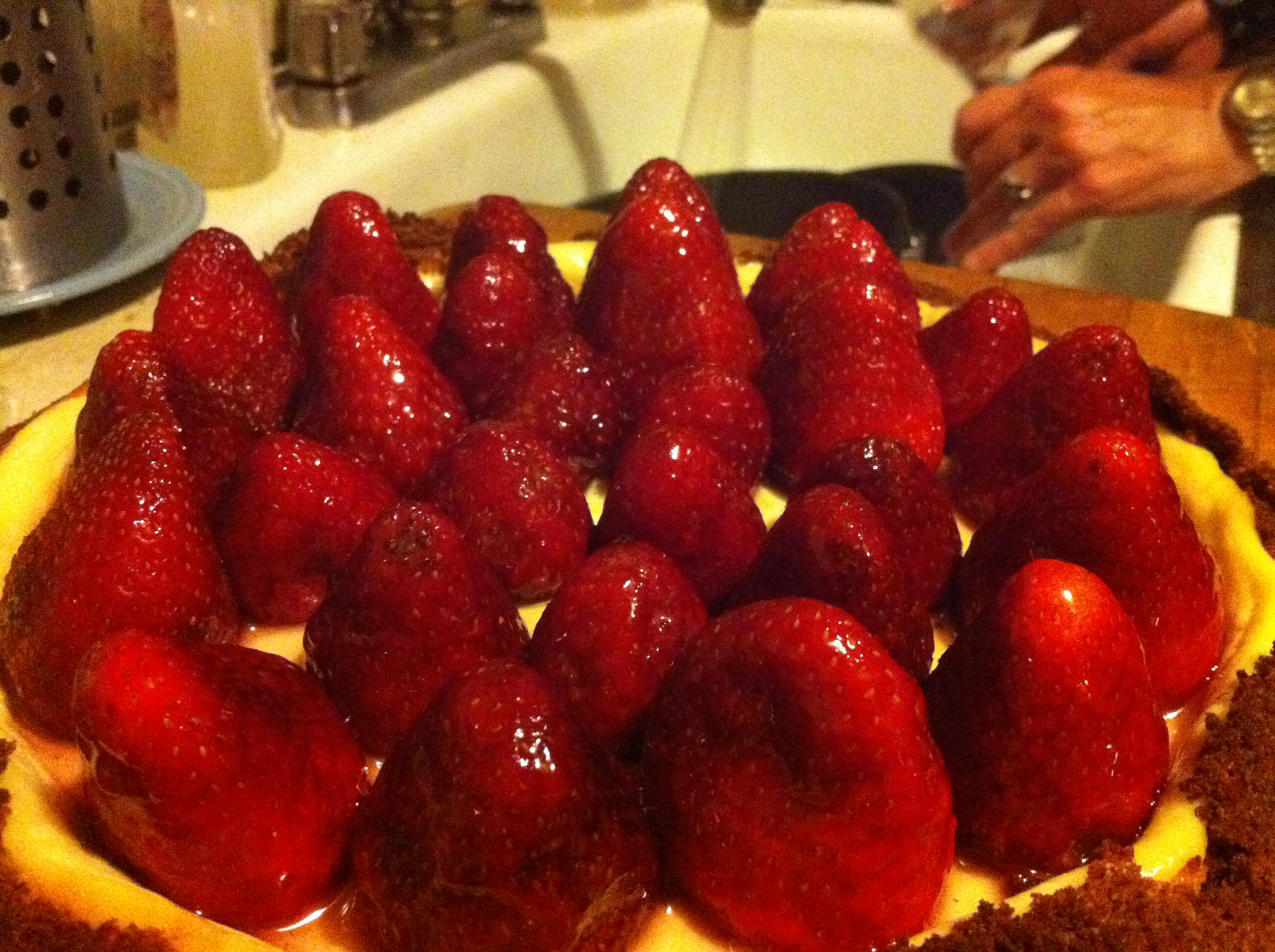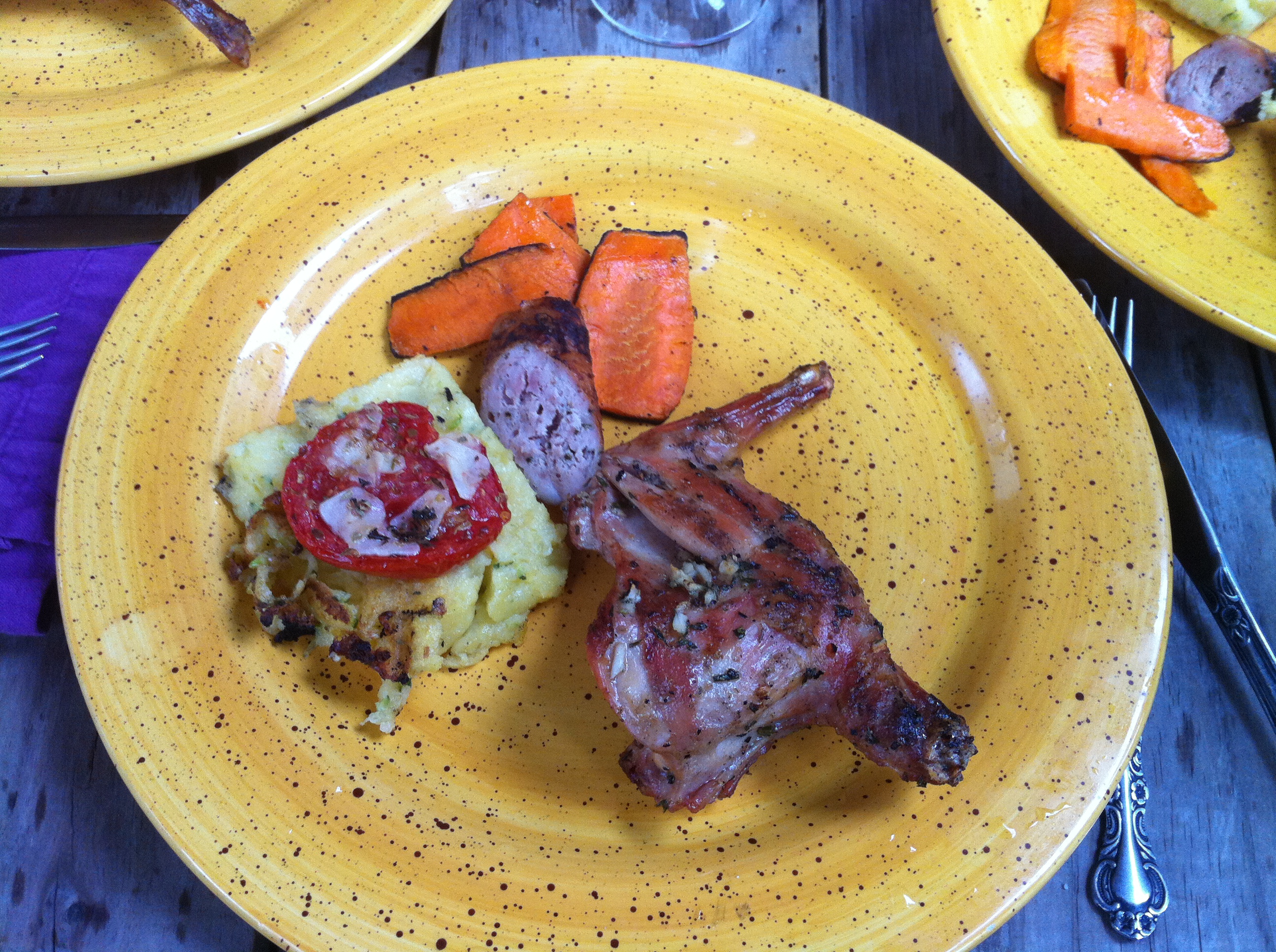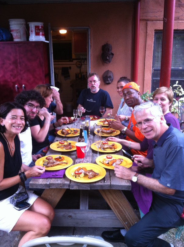 Upon arriving to the dinner everyone was antsy to get it started since I was late (as usual). I was pleasantly surprised by the courses that were on deck. The first dish was prepared by Adam which was a freshly grilled rabbit marinated with olive oil, garlic and rosemary and served with a polenta that had fresh pecorino romano cheese and grated zucchini, topped with a roasted tomato with garlic and fresh oregano. This was an absolutely great dish, and we were off to a good start. Next up was the alligator (fingers crossed), Swoosh! I nailed it, and it had just enough Cajun “kick” to wake up everyone’s taste buds. The meat was very tender and the Etoufee was very flavorful, totally Cajun! Next up Jim prepared panko crusted quail on ginger wasabi cole slaw and garnished with sriracha sauce, which I thought was a very clever and delicious dish. On to the venison meatballs that were definately a hit with its nice African flavors. Then Jim put out the last dish which was roasted shredded duck served with cashew butter and sorrano pepper jelly sandwich with an arugala, roast beet and fig salad. Yummy! Carol wrapped up the night with her delicious strawberry cheesecake. It was so good that I wish I had grabbed a slice to go. Overall all of the food was fantastic, I had a chance to catch up with a childhood friend (Whaddup Kim!), my NY teams ruled, and I ended my day happy. I wish every Sunday was this good. :) Special thanks to Jim & Andrea for hosting, also Adam, Alyssa, Kim, Steve, Carol, and Jerry.
