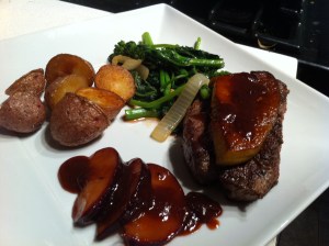 Filet Mignon is the most tender cut of beef, and is the most expensive. It’s also my favorite cut of steak because it is so flavorful.This beef cut can be quite pricey when dining out, but much more reasonable to make at home, especially if you purchase a whole tenderloin which I do normally. It is best when cooked medium rare since this cut does not have too much fat or connective tissue, it will dry out and become tough if overcooked. Give this steak a little love and attention when you cook it and the flavor goes a long way. So it is a rare treat for me to be able to pair the “perfect” steak with a delicate and delicious topping such as Fois Gras. I pan-seared the fois gras and topped my steak with it and drizzled a white wine plum sauce of my creation on top. I roasted some red potatoes in rendered duck fat (courtesy of Fossil Farms) and added broccoli rabe to seal the deal, and soon enough i was sitting in front of a dish that any restaurant would charge $70 or more for. So if you ever get the chance, be sure to try some Fois Gras you wont regret it. Bon Appetit!