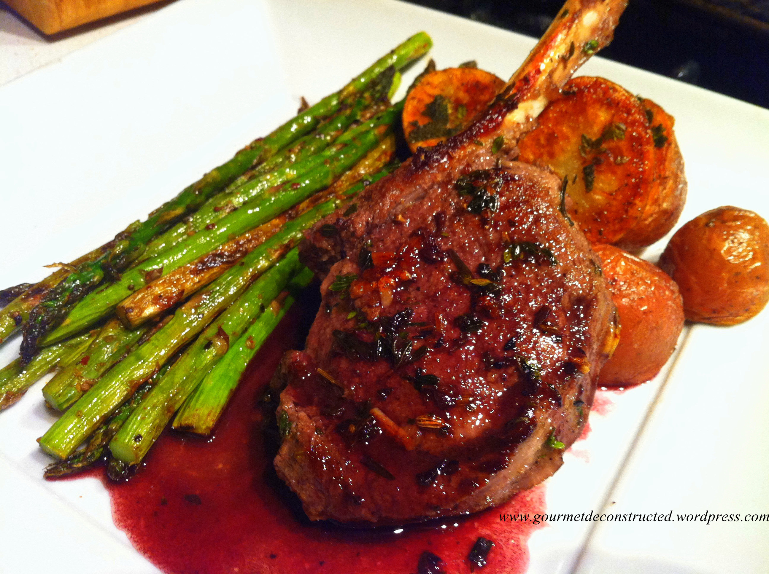 Antelope that are hunted in the wild are said to have “gamey” or “sagey” taste. As I explained in previous posts, the “gamey” flavor comes from the fact that the animals in the wild eat a very varied diet of weeds, acorns, wood bark, etc. This flavors the meat distinctively. Sagebrush makes up a large part of the antelopes diet, which may explain the “sagey” flavor. Since we are used to eating meat that is grain fed, which has a much milder flavor, game meat tastes strange to us now. We don’t need to worry about that here since this meat is farm raised. I cooked this the same way I would prepare a lamb chop, pan seared it and popped it in a 450 degree oven for a few minutes. I then pair it with roasted asparagus & potatoes (cooked in a bit of duck fat), and added my herbed merlot sauce to seal the deal. All I can say is wow! It was very tasty and a big hit in my household. So I highly recommend you try antelope — you wont regret it. Bon Appetit!