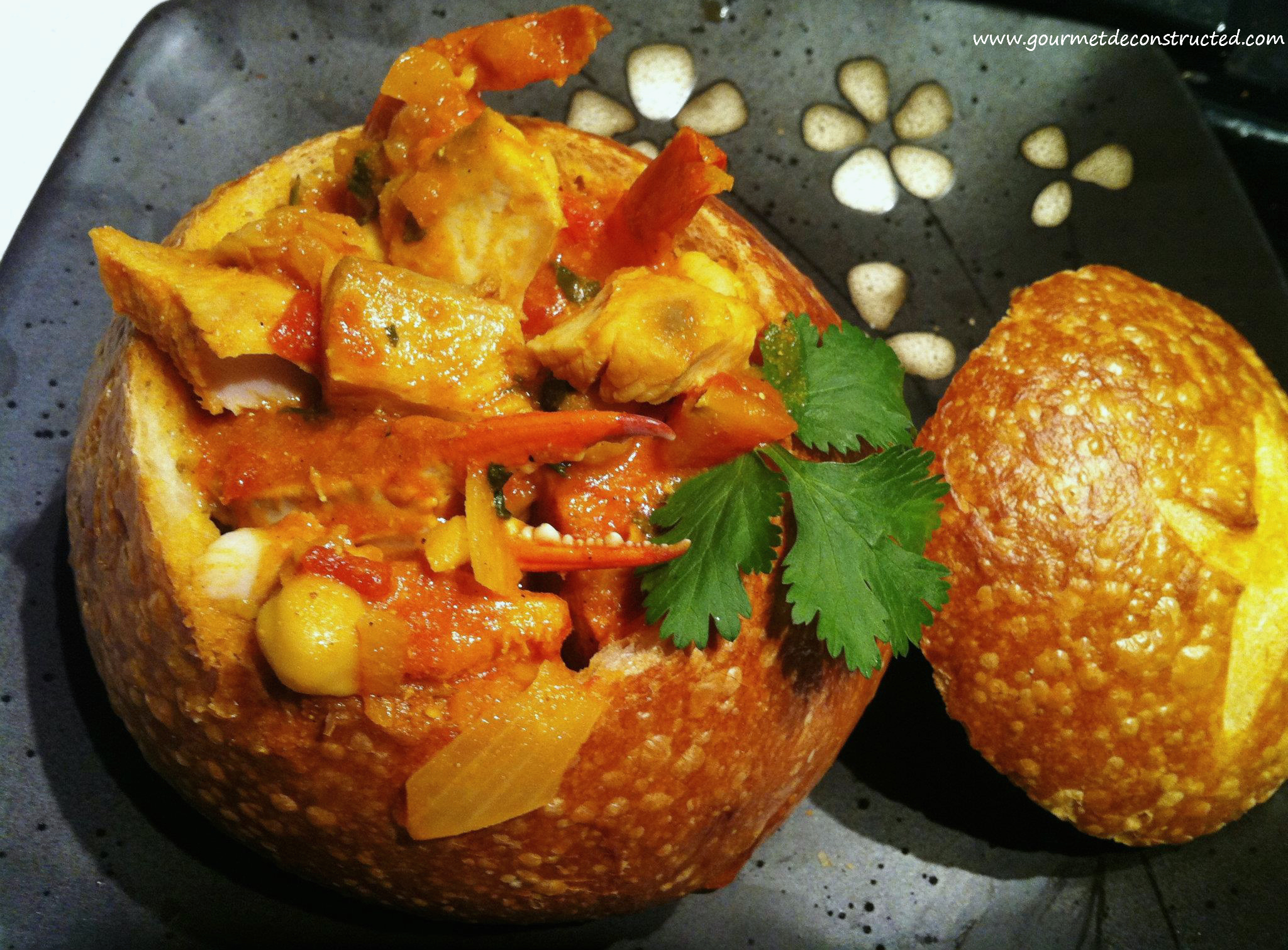 First remove outer top shell of the crab then clean out the the internal organs and cut each crab in half leaving 4 total clusters (you can have your seafood guy do this). If you are using bread bowls you need to carefully carve it open so it resembles a bowl, and use the scooped out bread for dipping. Heat oil in a large saucepan the add the onions and sautee until soft but not browned. Add tumeric powder, curry powder, chili powder, and garlic to the pan and fry for 3 minutes until spices become fragrant. Add the stock, 2 Tbsp of cilantro, tomatoes, and tomato paste then bring to a boil. Reduce the heat to medium-low and simmer for 15 minutes. Add stock as needed if it reduces. Throw in the shrimp, chunks of fish, crab clusters, and the chick peas then simmer for 10 minutes or until the fish has cooked. Mix in the mango chutney and simmer for 1 more minute and season with salt and pepper. Remove from heat and add an even amount to each bowl including 1 cluster of crab for each. Garnish with fresh cilantro leaves and 1 Tbsp of yogurt in each bowl and serve immediately. Bon Appetit!