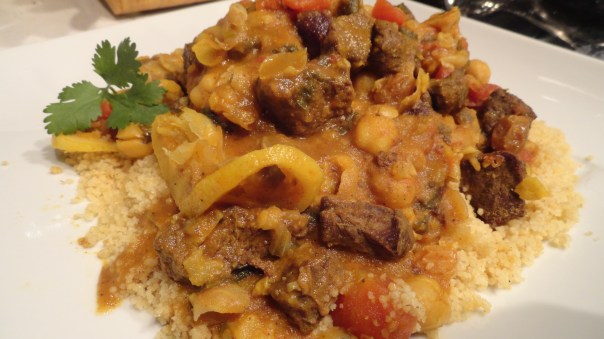 The delicious spicy cuisines of French colonial North Africa have left their mark on French cooking, which some of you know I’ve been exploring. This dish is traditionally prepared with lamb (d’Agneau), but tonight I will use venison since I have an abundance of it from a friend who hunts. Lamb stew meat should be easily available at most local markets so don’t break your neck looking for venison. The word “tagine” is the name for the conical-shaped pottery dish in which this delicious meal is usually cooked. I don’t have a tagine so I guess pots and pans have to do. :) Despite the lengthy ingredient list and multiple steps, this dish is simple to make for the home cook so I encourage all to try this recipe. Dont be shy, leave feedback telling me if it worked for you. Bon Appetit! (special thanks to George Perkins for donating the protein for this dish)